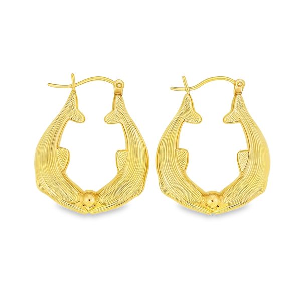 (941) 497-633114K Yellow Gold Kissing Dolphins Hoop Earrings