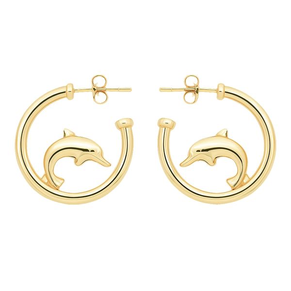 (941) 497-633114K Yellow Gold Round Post Hoop With Dolphins Earrings